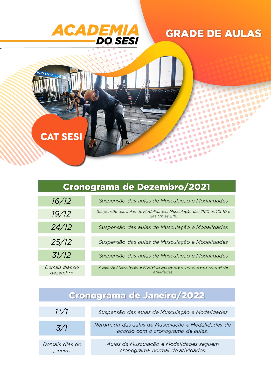A época das festas e confraternizações chegou! No fim de ano a Academia do Sesi não para, porém o ritmo intenso dos treinos dá lugar a prática de exercícios físicos com foco na qualidade de vida para equilíbrio corporal e mental. Entre os dias 24 a 26, e 31 dezembro, e entre 1º e 2 de janeiro o centro de atividades - CAT Sesi Limeira permancerá fechado. Confira o cronograma de aulas de dezembro e janeiro.